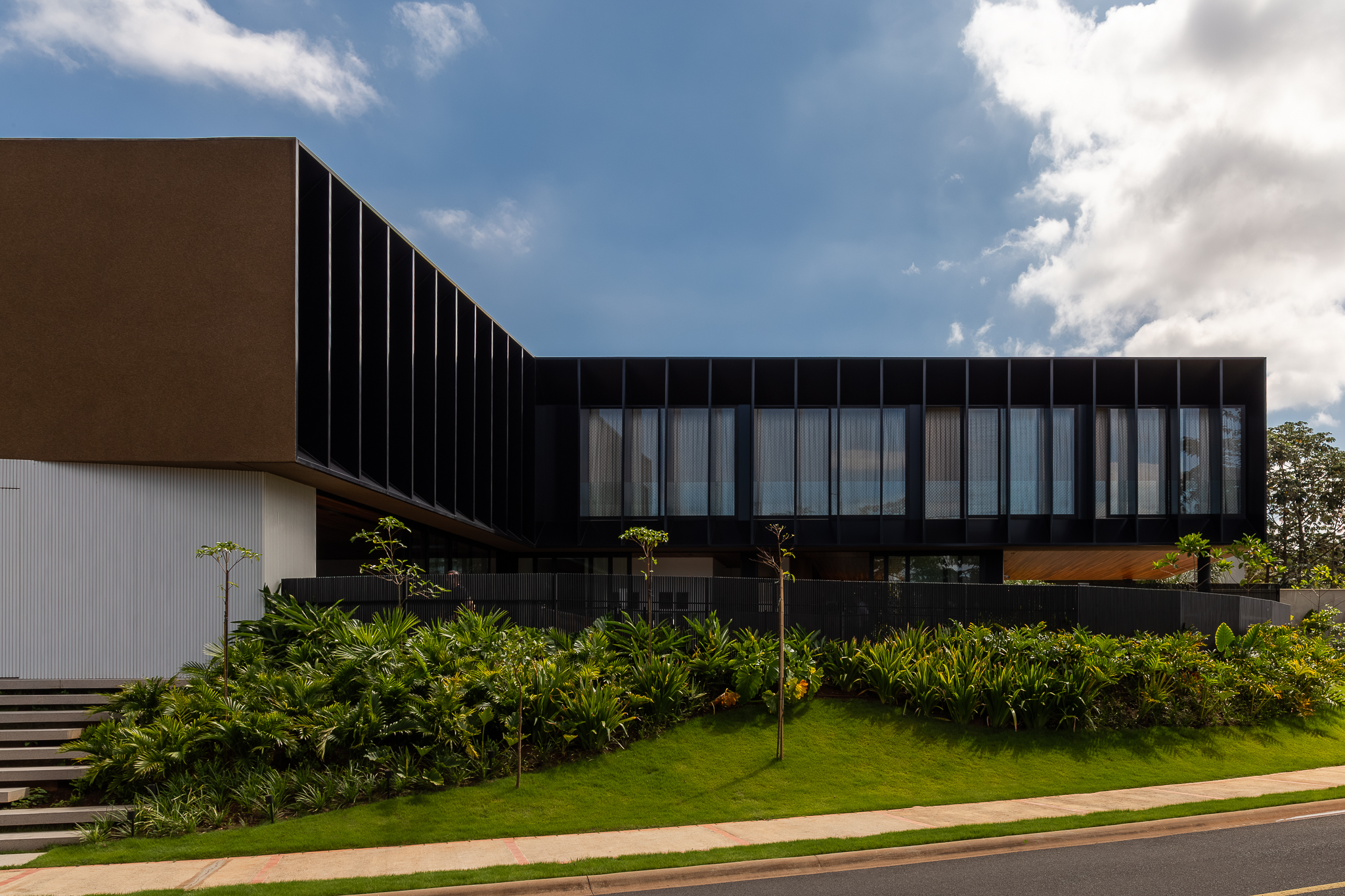 A linguagem arquitetônica é marcada por contrastes de materiais e pela organização volumétrica clara. O bloco superior, de tonalidade mais escura, parece flutuar sobre os planos de vidro do pavimento térreo. Suas linhas verticais, marcadas pelo desenho do brise metálico, promovem uma forte identidade ao projeto, além de controlar a incidência solar e garantir conforto térmico.